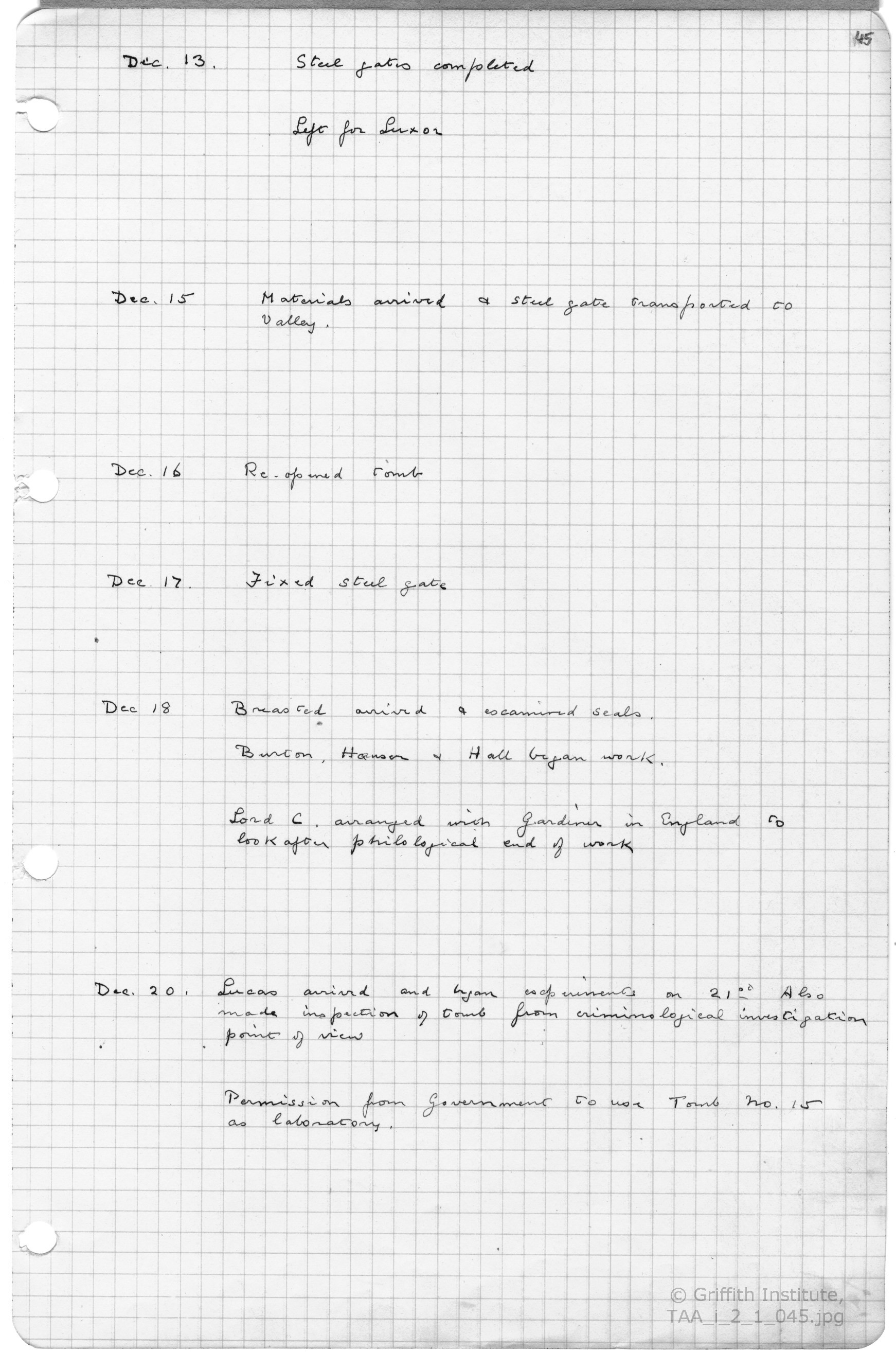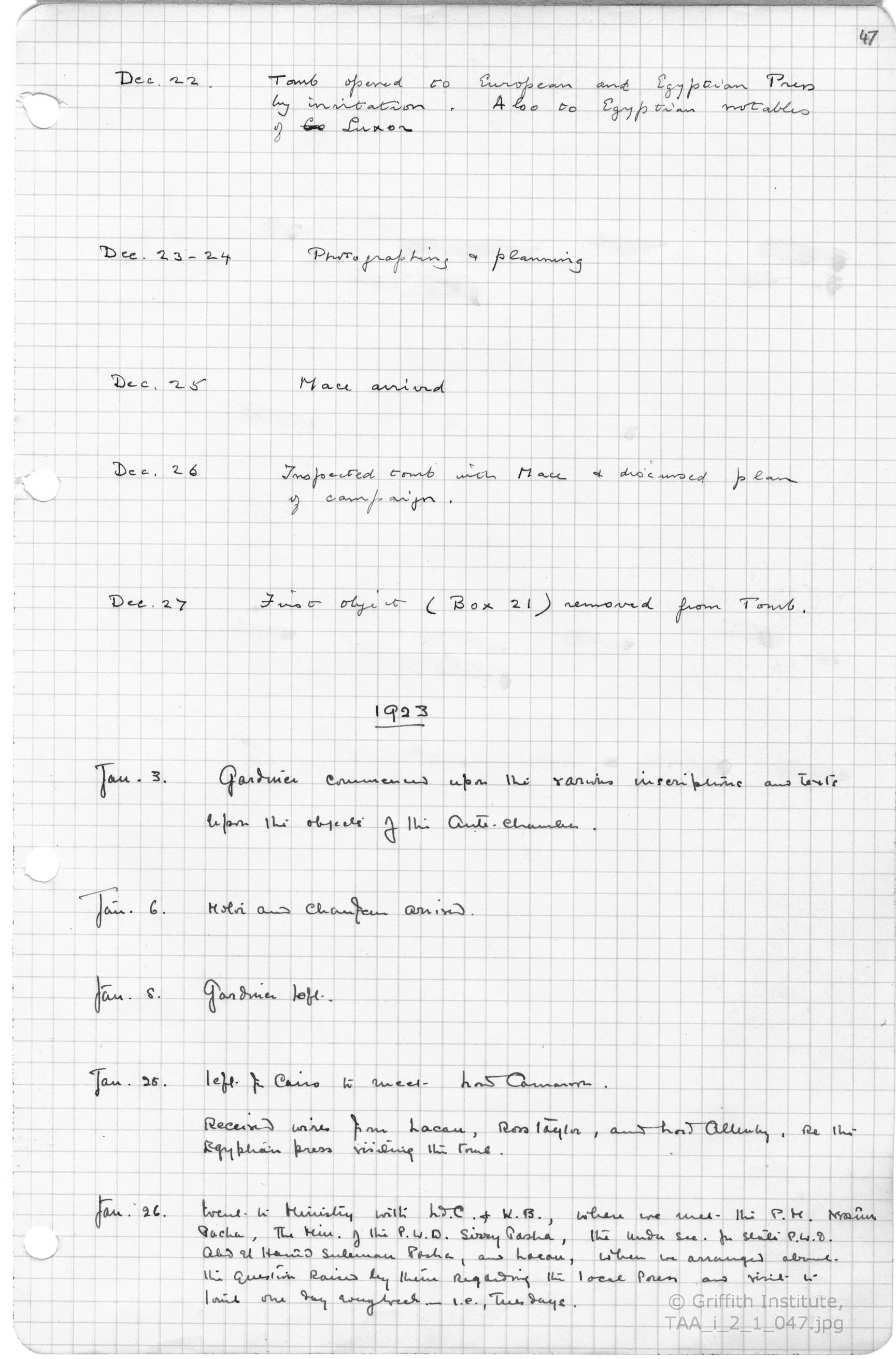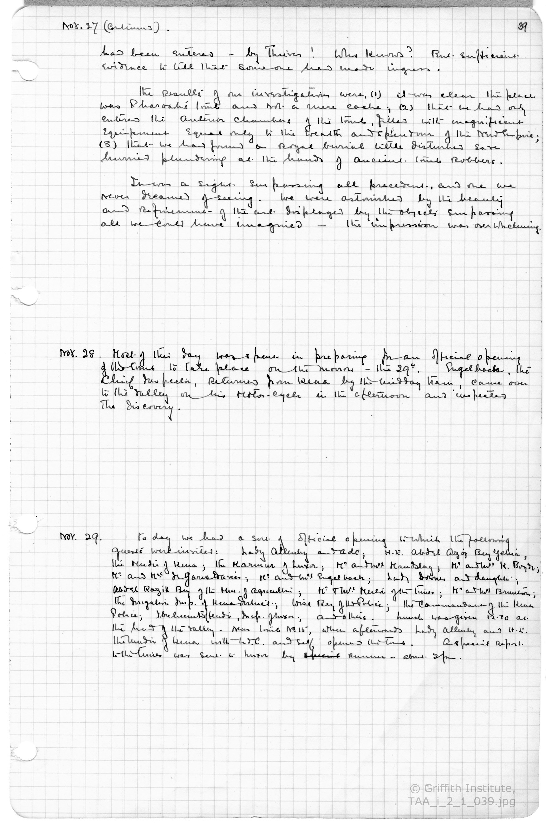 The journal is housed within its original black ring-binder, stamped "Walker's Loose-Leaf Book, Cover Number 138" on the inside front cover, it measures 33 by 21.5 by 1 cm. and contains 148 loose-leaf, graph-lined pages. TAA Archive i.2.1, pages 25 to 53. All entries are in Howard Carter's hand except for those between December 5th and 27th 1922 (pages 43 to 47) which were entered by Arthur C. Mace.