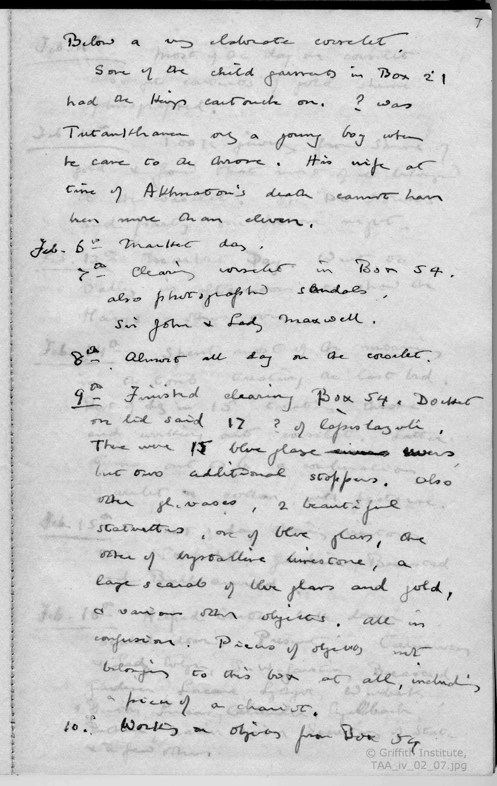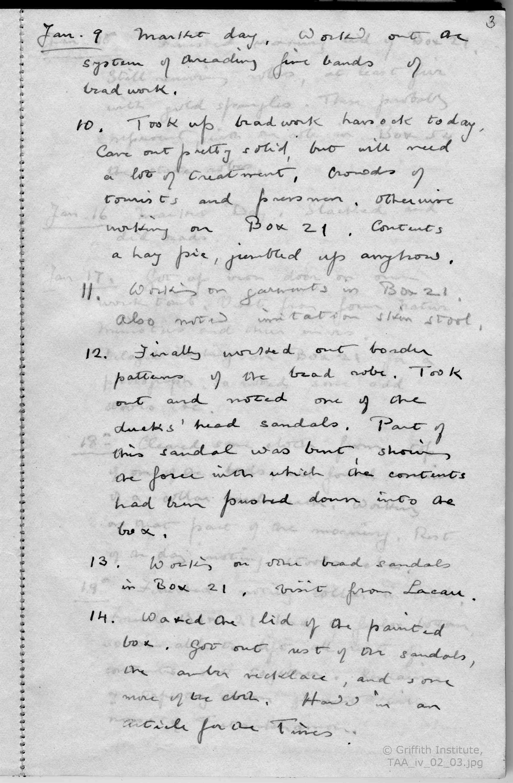 This is Arthur Mace's journal for the 1st excavation season of the tomb of Tutankhamun which took place during Winter 1922 and Spring 1923. The events covered by this journal are the recording and conservation of the painted box (Carter object no. 21) (January 6th to February 3rd 1923), a comment on the ancient tomb robbery (March 25th 1923) and the death of Lord Carnarvon (April 5th 1923).