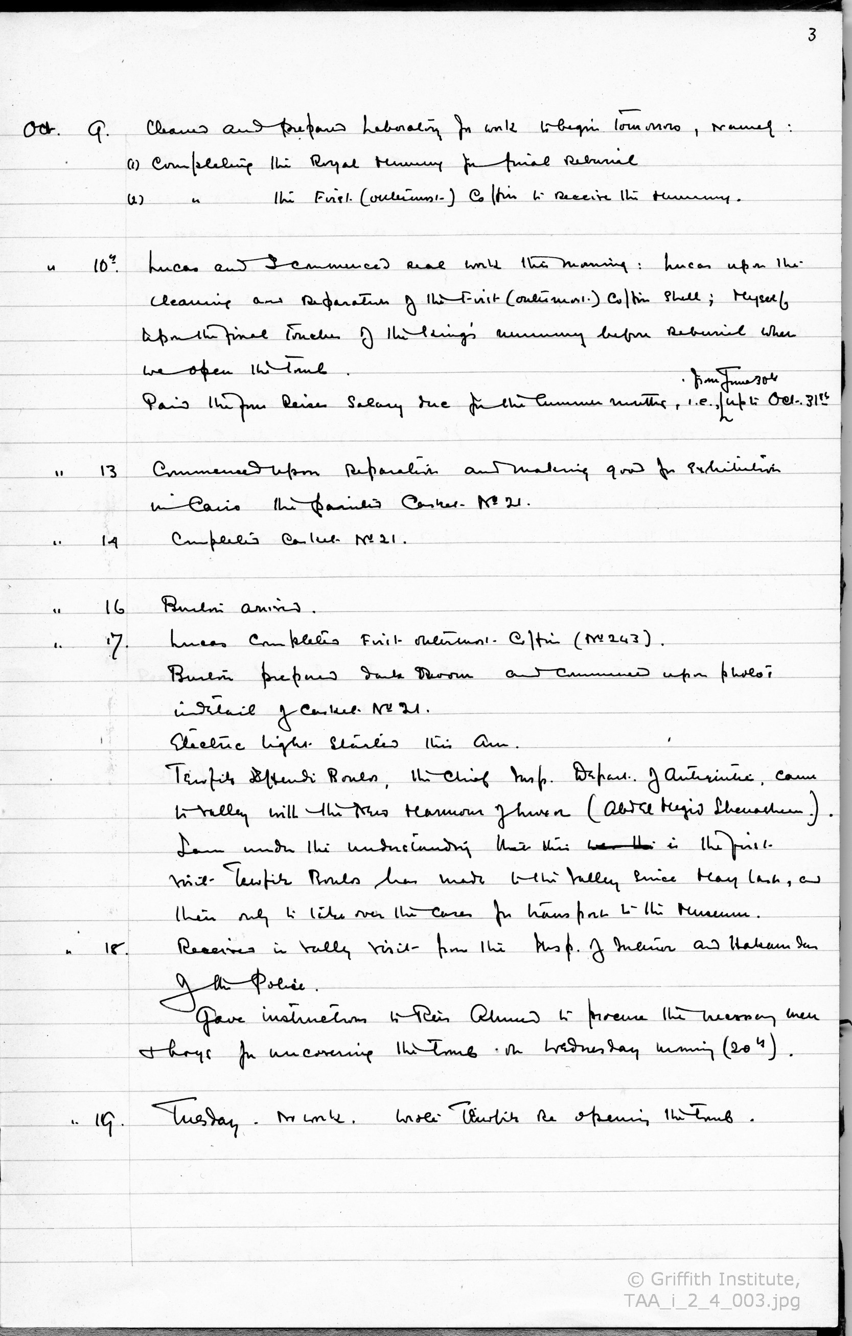 The journal is a bound buff-coloured volume with a printed "Egyptian Government" label on the front cover board, it measures 33.5 by 21.5 by 1.5 cm. and contains journal entries on 65 ruled pages. TAA Archive i.2.4, pages 1 to 25. All entries are in Howard Carter's hand.