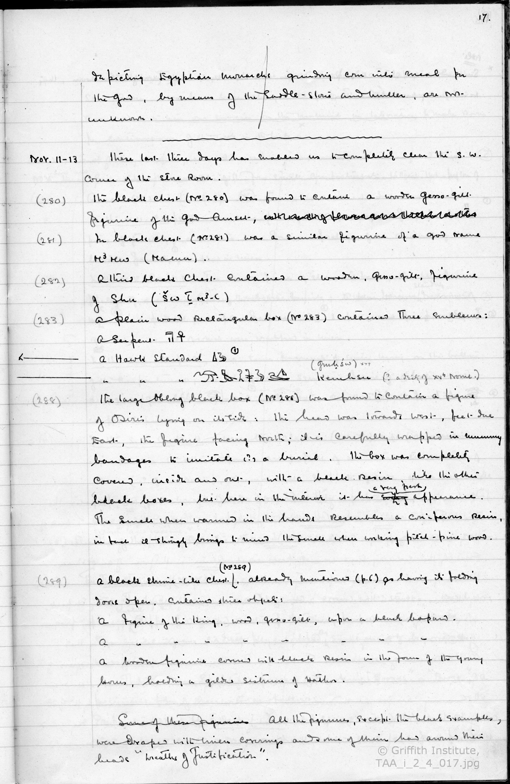 This is Howard Carter's journal for the 5th excavation season of the tomb of Tutankhamun which took place between Autumn 1926 and Spring 1927. The events covered by this journal are the return of Tutankhamun’s mummy to his sarcophagus within the tomb and the initial assessment of the Treasury (October 23rd 1926), the removal of the Anubis-jackal shrine from the Treasury (October 27th 1926), and the opening of a black shrine-like chest which contained five statuettes of Tutankhamun (November 8th 1926).