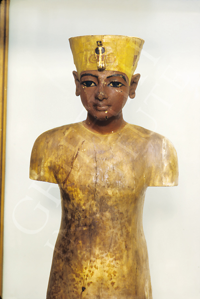 Upper part of the 2nd (middle) anthropoid coffin, Tutankhamun wearing nemes headdress and holding crook and flail. (Carter number 254)