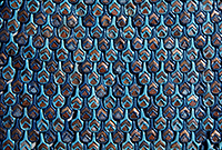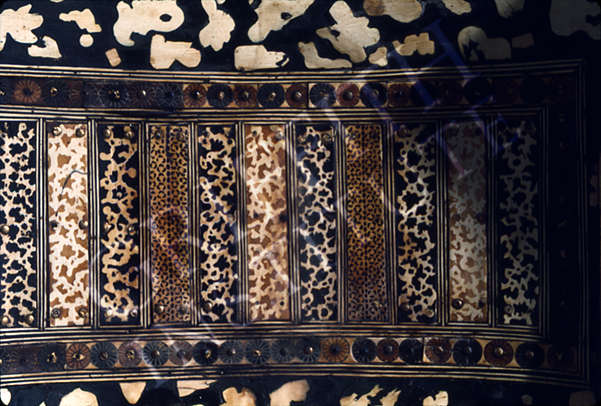 Wood covered with gold foil inlaid with red, blue and turquoise glass.