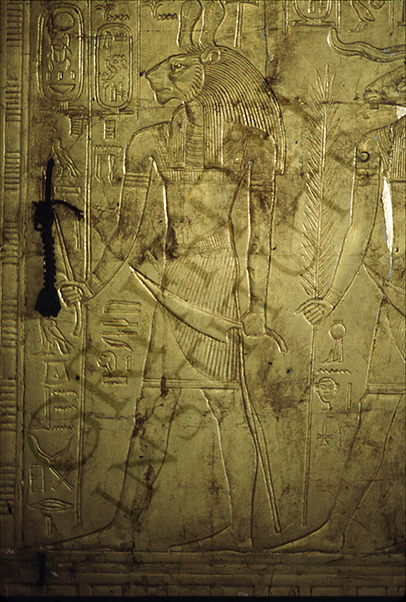 heb-sed scene, Tutankhamun presented to Amun by hawk-headed god and a goddess, and below, part of corslet. (Carter number 54k)