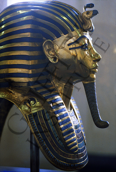 Tutankhamun wearing nemes headdress with the royal insignia