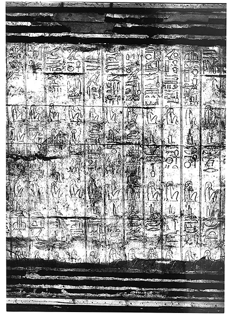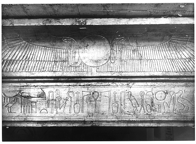 The over-all decoration of the interior comprises incised magical texts recounting the "Destruction of Mankind," framed with a treble margin in black resinous material like lacquer upon the gilding. The roof is entirely coated with a similar black resin, and down the centre is a series of open-winged Upper Egyptian Nekhebet vultures in gold.