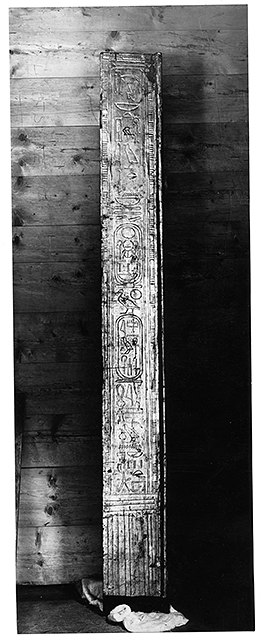 The roll moulding beneath the cavetto cornice and carried down the external angles of the corner posts is planted, i.e. separately worked and fixed in position with headless wooden pins.