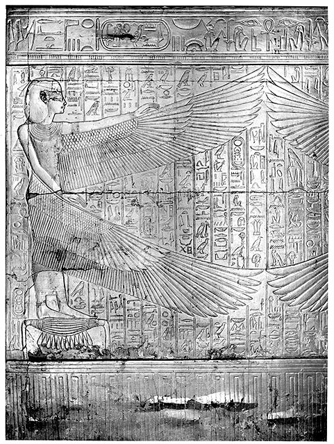 The over-all decoration, incorporating various designations of the King, religious representations and texts, is incised upon the gesso-gold overlay. The cartouches in the texts show, however, distinct traces of having been altered: their gilding is in many cases of a mere brilliant yellow colour and less tarnished than the rest of the gold overlay. The decoration as a whole has also a more distinct El Amarna style than that of the preceding shrines. Thus, it was at first thought that the cartouches were originally the Aten-form of the King's name, but since both the prenomen and nomen have been changed it is not improbable that the shrine was originally intended for another monarch of this line of hereditary rulers - possibly Semenkh-ka-re. The decoaration of the upper surface of the roof varies from that of the preceding shrines. Here, instead being completely gilded and incised with formulae, it is coated all over with a black resinous material, which is divided into a number of small squares by longitudinal and transverses gilded bands of incised inscriptions.
