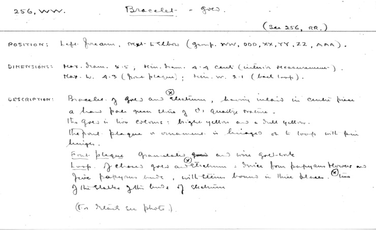 DESCRIPTION: Bracelet of gold and xelectrum, having inlaid in centre piece a hard pale green stone of (?)quartz nature. The gold is two colours: bright yellow and a dull yellow. The front plaque or ornament is hinged on to loop with pin hinges. Front plaque granulated and wire gold-work Loop of chased gold and xelectrum - device four papyrus flowers and five papyrus buds, with stems bound in three places. xTwo of the stalks of the buds of electrum