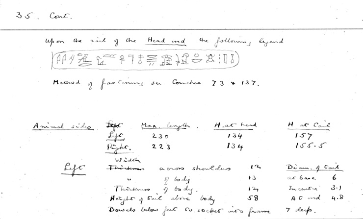35.Cont. Upon the rail of the Head end the following legend <> Method of fastening see Couches 73 & 137. Animal Sides Max. length. H. at head H at tail Left 230 134 157 Right. 223 134 155.5 Left Width across shoulders 12 " of body 13 Thickness of body. 12 Height of tail above body 58 Diam. of tail at base 6 In centre 3.1 at end 4.8 Dowels below feet to socket into frame 7 deep.