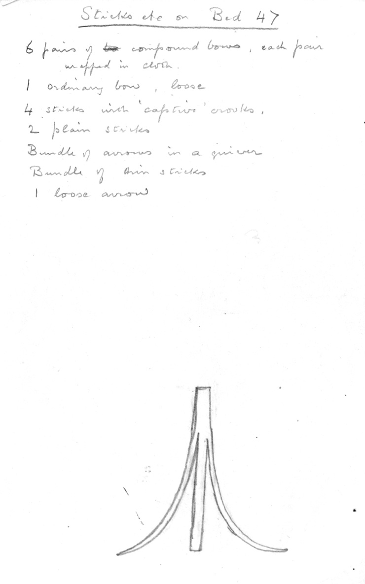 Sticks etc. on Bed 47 6 pairs of compound bows, each pair wrapped in cloth. 1 ordinary bow, loose 4 sticks with 'captive' crooks. 2 plain sticks Bundle of arrows in a quiver Bundle of thin sticks 1 loose arrow. <>