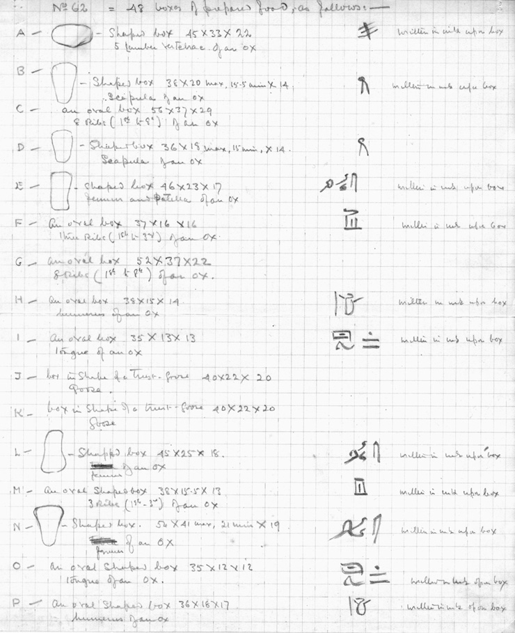 B - <> - shaped box 38 x 20 max, 15.5 min x 14 <> written in ink upon box scapula of an ox