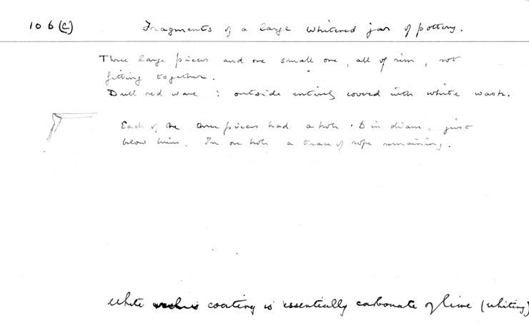 Each of the three pieces had a hole .6 in diam, just below rim. In one hole a trace of rope remaining.