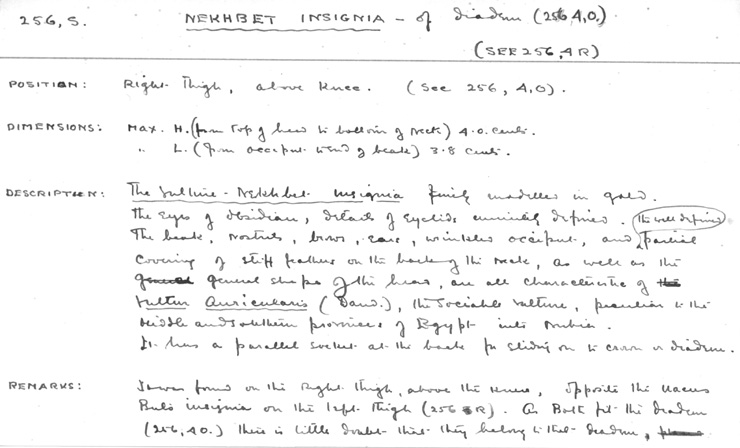 REMARKS: It was found on the right thigh, above the knee, opposite the uraeus Buto insignia on the left thigh (256 R). As both fit the diadem (256, 4 O) there is little doubt that they belong to that diadem.