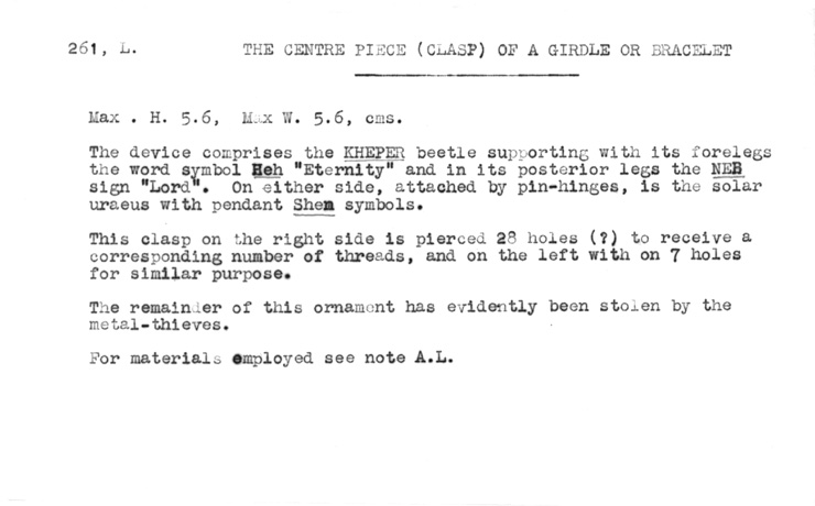 Handlist description: Centre piece (clasp) of girdle or bracelet Card/Transcription No.: 261l-1 |