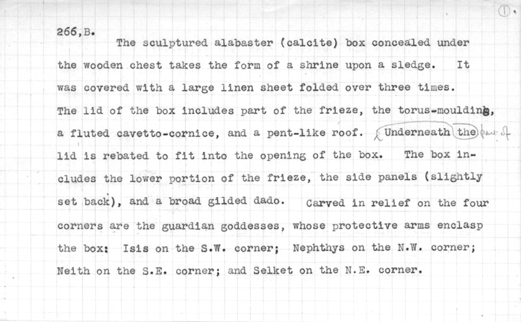 The sculptured alabaster (calcite) box concealed under the wooden chest takes the form of a shrine upon a sledge. It was covered with a large linen sheet folded over three times. The lid of the box includes part of the frieze, the torus-moulding, a fluted cavetto-cornice, and a pent-like roof. The underneath part of the lid is rebated to fit into the opening of the box. The box includes the lower portion of the frieze, the side panels (slightly set back), and a broad gilded dado. Carved in relief on the four corners are the guardian goddesses, whose protective arms enclasp the box: Isis on the S. W. corner; Nephthys on the N. W. corner; Neith on the S. E. corner; and Selket on the N. E. corner.