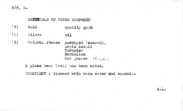Handlist description: Amethyst scarab bracelet Card/Transcription No.: 269m-2 |