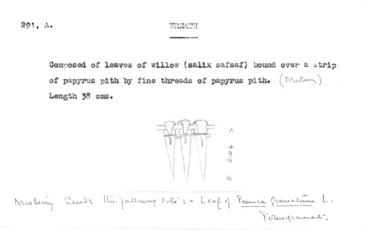 Composed of leaves of willow (salix safsaf) bound over a strip of papyrus pith by fine threads of papyrus pith. (Newberry). Length 38 cms.
