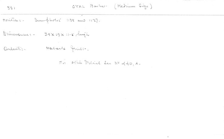 Handlist description: Oval basket (medium size) Card/Transcription No.: 381 |
