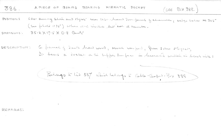Handlist description: Piece of board bearing hieratic docket, belonging to lid 537 of box 388 Card/Transcription No.: 386-1 |