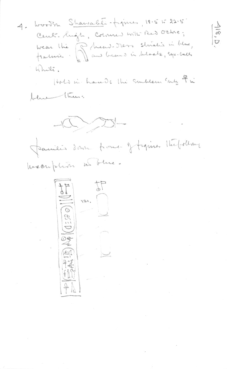 Handlist description: Four wooden shawabti figures Card/Transcription No.: 418d |
