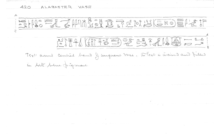 Handlist description: Collyrium or unguent vase of situla form (calcite) Card/Transcription No.: 420-4 |