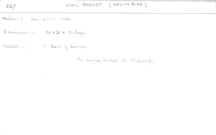 Handlist description: Oval basket (medium size) Card/Transcription No.: 567-1 |