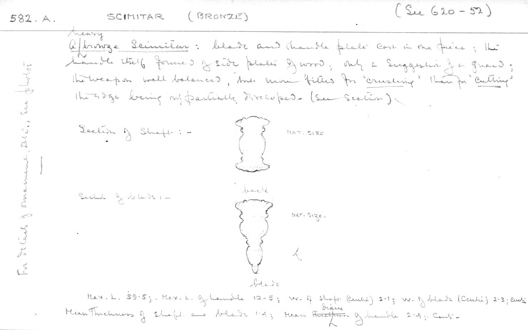 A heavy bronze scimitar: blade and handle plate cast in one piece; the handle itself formed of side plates of wood, only a suggestion of a guard; the weapon well balanced, but more fitted for 'crushing' than for 'cutting' the edge being only partially developed - (see section).