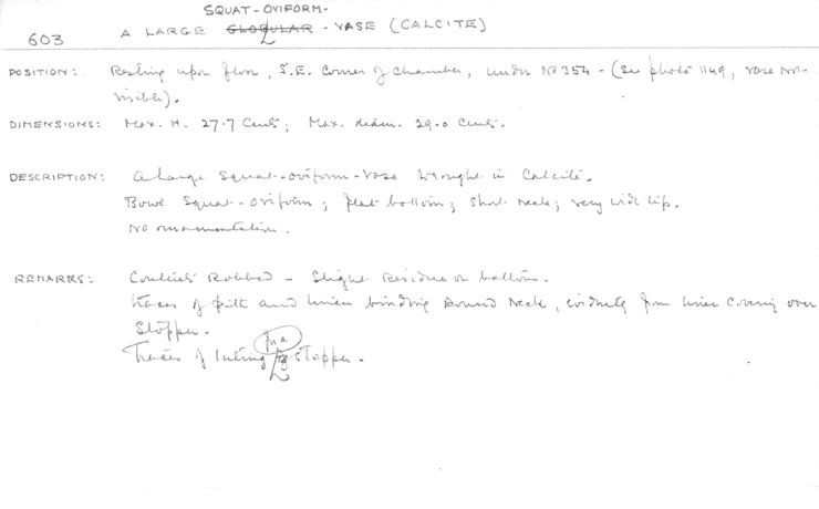 Handlist description: Large squat oviform vase (calcite) Card/Transcription No.: 603 |